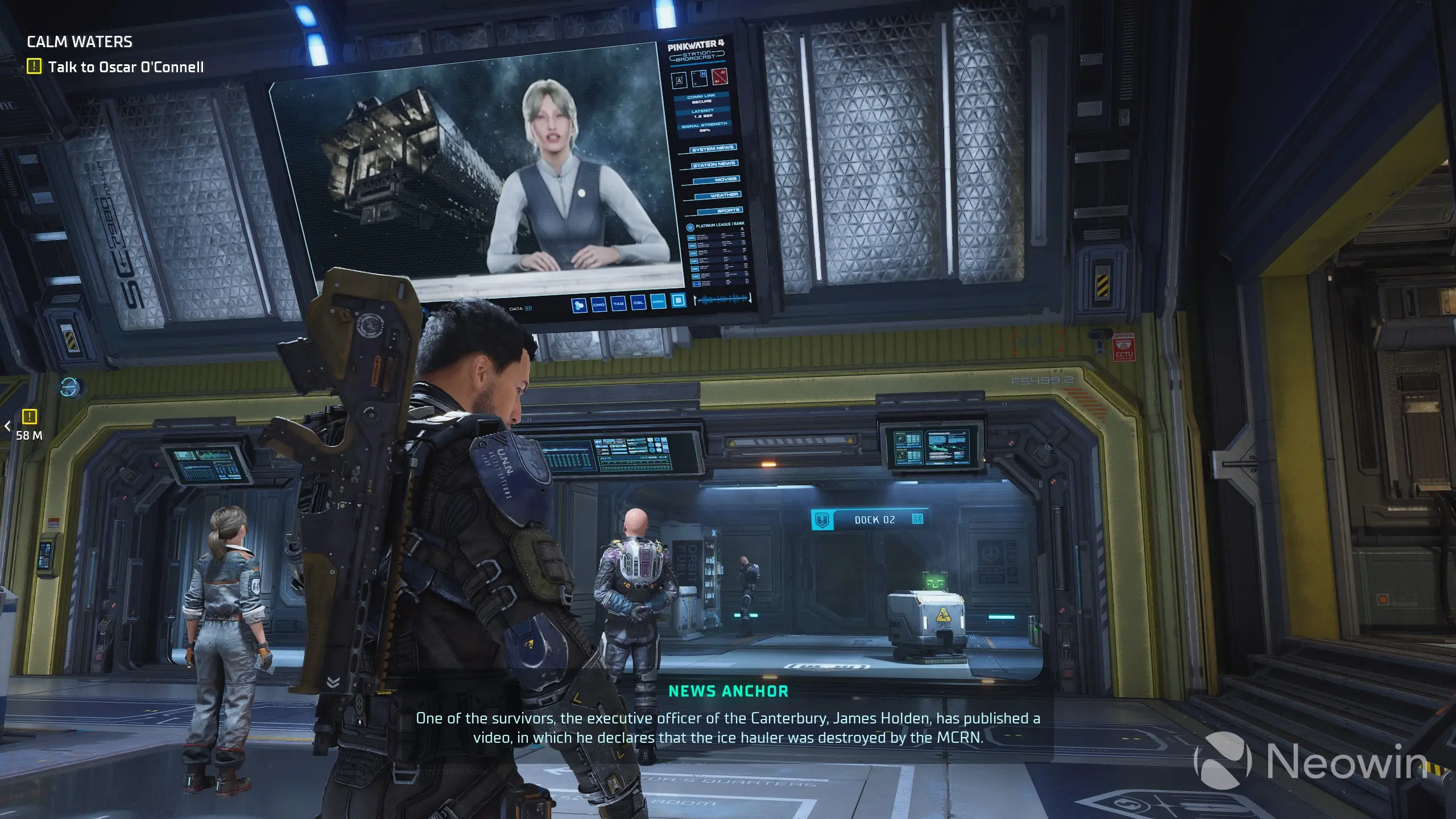 The station itself is very detailed with the same industrial look across every surface and corridor. Especially thanks to the impressive lighting (the game is powered by Unreal Engine 5), the overall atmosphere is just right. There are news broadcasts on the screens about the Eros situation and another survivor group led by James Holden (a familiar name to fans) and large numbers of NPCs going about their day gossiping about co-workers. I was also a fan of the rugged clothing of characters, including my own. It looks like a modular system with multiple layers built out of cloth, armor pieces, and electronics. One of the tech pieces is a hand-mounted computer that allows for a quick look at things like the inventory, equipment, skill trees, or companion details. All of these were mostly barren in this early build.